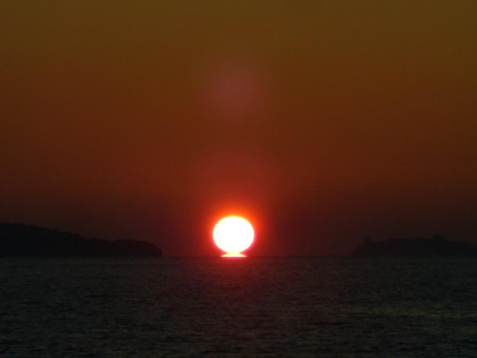 Thank you, John, for sharing the answer. Yes, the question regarding the wind is important in this case, since the image shows the opposite of what one could conclude from the air and water temperatures. An other point could be how deep the water temperature has been measured. I also could imagine a thin layer of cold air on top of the water which didn't mix with the warmer air above it. More information on the temperature profile of the atmosphere could be found from a sounding of a nearby radiosonde station. One could possibly also find some further information on the sea surface temperature (SST). Do you know how to retrieve such data? If not, let me know date, time and location, I can give it a try. At my location I observe these days also inferior mirages when the sun is setting. In December we had for about a week or ten days a warm periode with temperatures about 10C higher than average which heated the water. Now having again colder temperatures the inferior mirages show up. On January 1st I happened to catch a nice one which I attach here. (I notice that my lens needs some cleaning.) Marcel