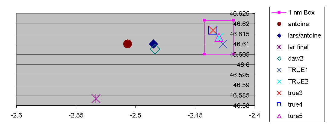 I set up an 'error' equation to find the RMS difference between the 4 computed and calculated angles (3 altitudes and the LD) as a function of final Lat, Long, and time difference (F above). Altitudes and LD calculated using USNO NOVAs and JPL DE405 as inthe previous problem. I use the time offsets from the input data set and the Lat and Long offsets calculated as shown by others. The search algorithm then iterates to minimize the 'error' function. Voila!