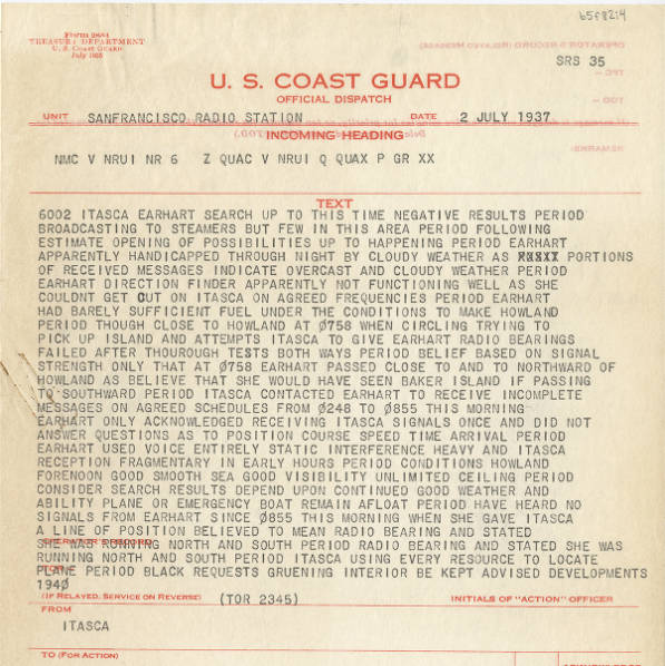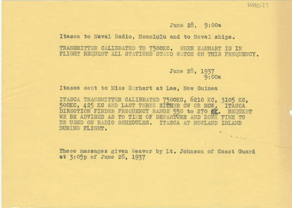 There were NO RDF bearing taken by Itasca or any other location on her radio transmissions while she was in flight. Itasca did not have the capability to take bearings on 3105 khz, the frequency that Earhart transmitted on since Itasca's RDF only covered 270 to 550 khz. After the disappearance there were bearings taken on unidentified radio signals that some people believe came from her airplane after ditching or crashing on dry land. NONE of these radio signals had any identification, no "this is Earhart" or "this is KHAQQ" nor "de KHAQQ" nor, in morse, " -.. . -.- .... .- --.- --.- "