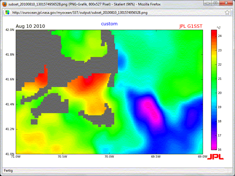 These sources may eventually be useful when investigating some abnormal refraction phenomenon. However, in the case of John's photo of the light house it unfortunately can not explain the reason for the inferior mirage. The sea was about as warm as John mentioned and the air had about the same temperature or was even slightly warmer. I attach here a screenshot of the JPL-data for August10, 2010 showing the SSTs in the area where John took the photos from the light house.