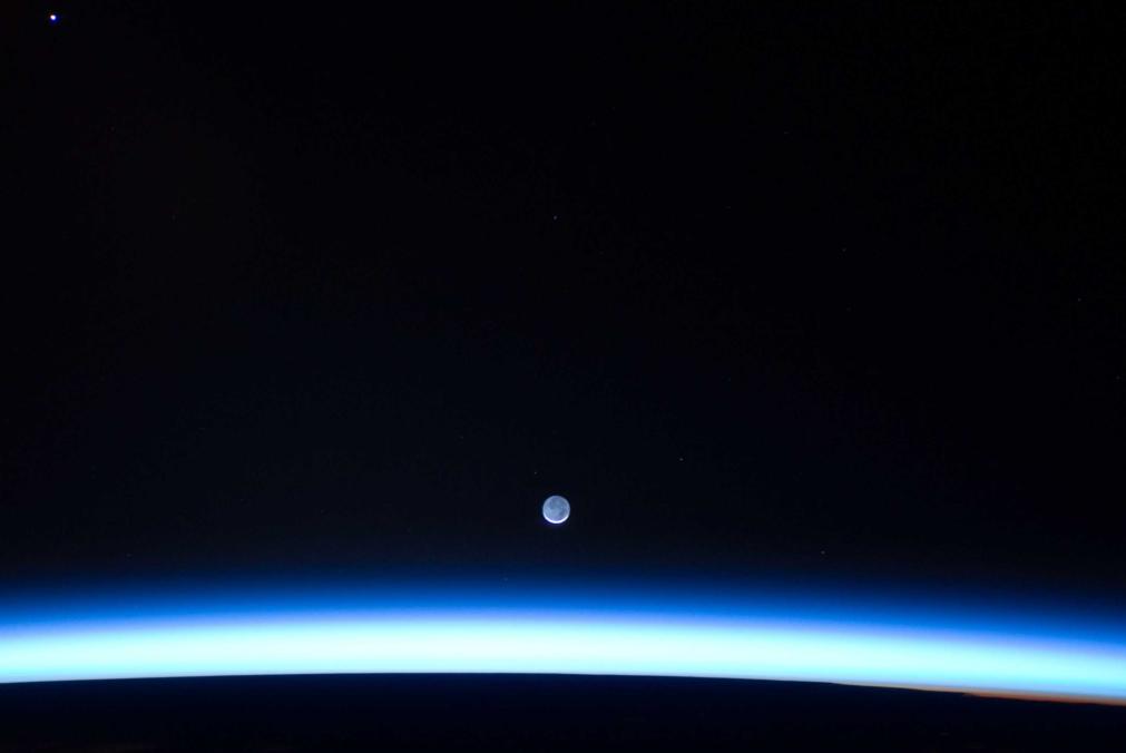The date of the image, March 6, 2011, can be assumed to be correct within one day. The puzzle is simple: where was the space station when the photo was taken (above what latitude and longitude) and how accurate do you think that position is, and what was the time and how accurate is that? The bright "star" in the photo in the far upper left (when the horizon is at the bottom) is Jupiter, but for the lunar distance aspect of this, I recommend using the stars that are very close to the Moon. These are various stars in one of the "fish" in the constellation Pisces. The image caption says that this is a gibbous moon, but actually it's a thin sliver of a crescent moon only about one day after New Moon. It looks more or less full by earthshine. If you look closely, you can also find the planet Uranus at about the same altitude above the horizon as the Moon. The limiting magnitude in the photo appears to be around 7.