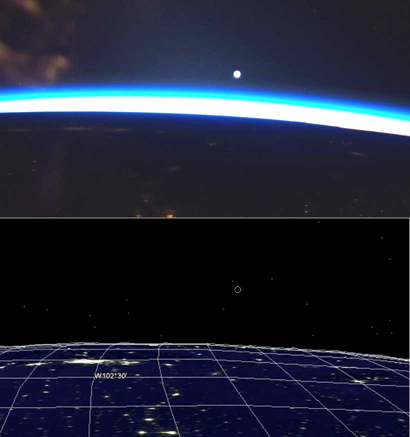 I've also been wondering about the cities faintly visible below the horizon. How could we ever identify them given that there is clearly cloud cover across much of the land below? Well, I spent this evening puzzling over it. At first I used various "flat images" of city lights seen from orbit. From that I had a good guess that the triangle of small cities near the center of the image were probably Grand Island, Nebraska plus two neighbors (Hastings and Kearney). Then while googling around, I discovered that Google Earth has a city lights layer built in, so I was able to align things just right and sure enough, it all checks out. Off in the distance below iota Ceti, those fuzzy blobs of light are the lights of Denver, Colorado and nearby cities showing through overcast. A comparison image is attached. The top half is a contrast-enhanced copy of the original astronaut photo. The bottom half is a screenshot from Google Earth.