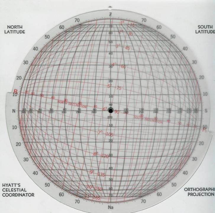 Attached file shows the device. The booklet is the instruction manual. Red scale is on a transparent, rotatable overlay. The other side is similar with a stereographic projection. Does coordinate transformations with star finder accuracy. (I seem to recall trying to make one these, but haven't been through the files yet.)