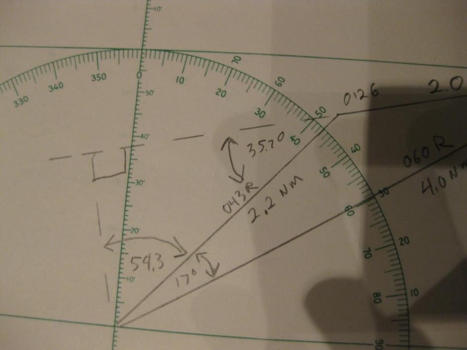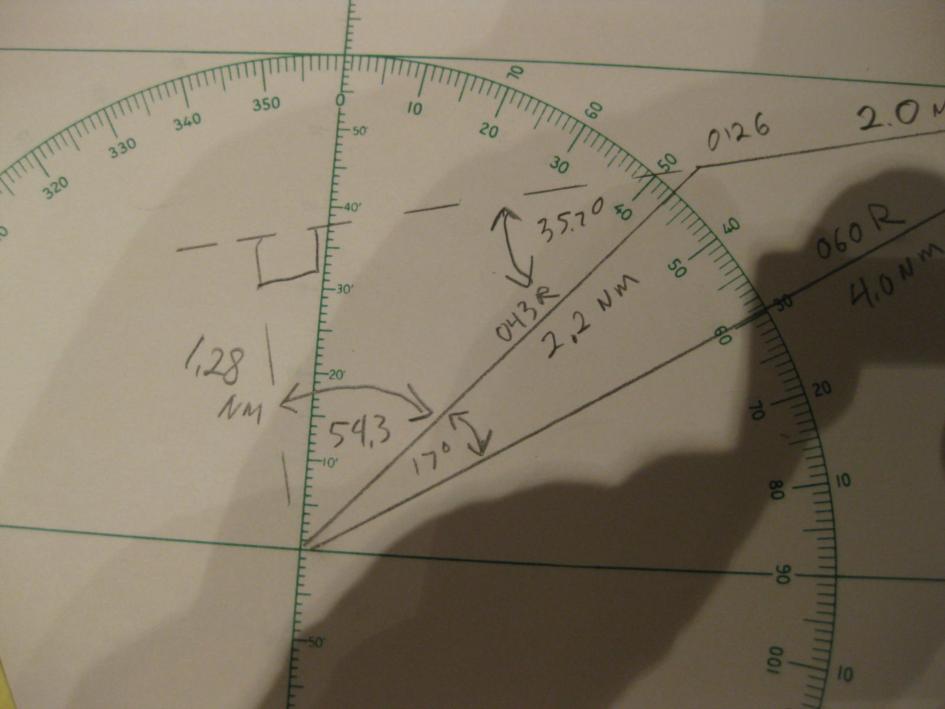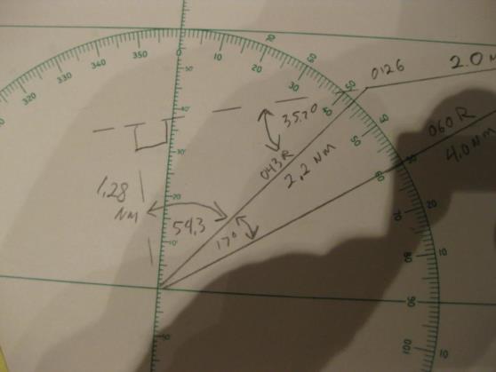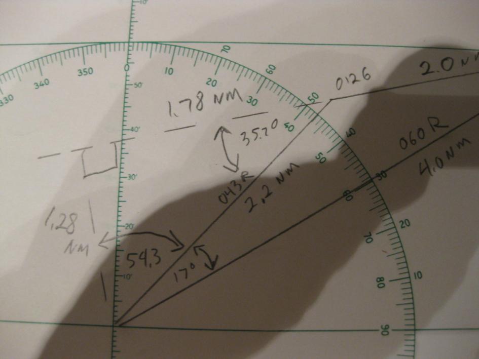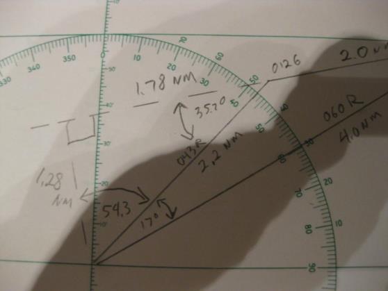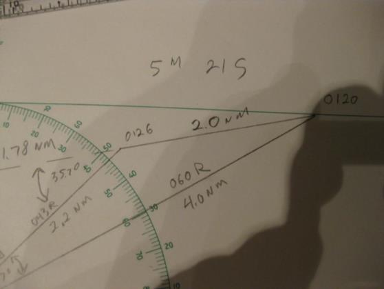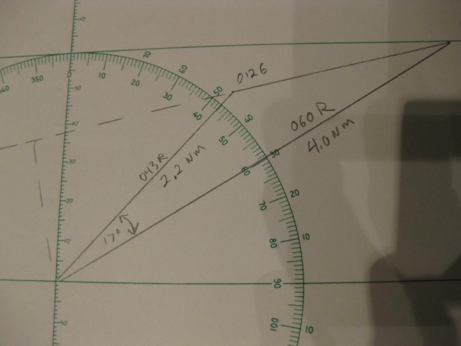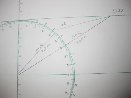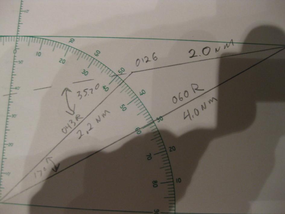 | Sure, it's easy. I have attached several photos of a sample plot to show how the calculation proceeds. At 0120 the vessel bears 060° relative, distance 4.0 NM. At 0126 the vessel now bears 043° R, 2.2 NM. The difference in bearings is 017°. With this information we use the law of cosines to find the length of the third side which is 2.0022 NM. With the lengths of all three sides we use the law of sines to find the angle between the relative bearing to the second position and the direction of relative movement which is 35.7°. At the point of closest approach the angle between the realative bearing and the direction of relative movement is 90° the sine of which is 1. Now using the law of sines again we compute the distance at the point of closest approach which is 1.28 NM. Using the law on sines again we compute the distance the other vessel moves from the second position to the point of closest approach which is 1.78 NM. Next we divide this distance by the distance traveled between the first two positions and then multiply by the time between the first two positions to find the time to the point of closest approach which is 5 minutes and 21 seconds. gl --- On Mon, 12/26/11, Amrin Shahziya <ammushaz@gmail.com> wrote: