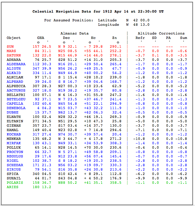 Early twilight starting at UT 2230 4/15/1912 ZD +3 Lat. 42* N Lon. 47* 30' W (Sun Hc -8*)