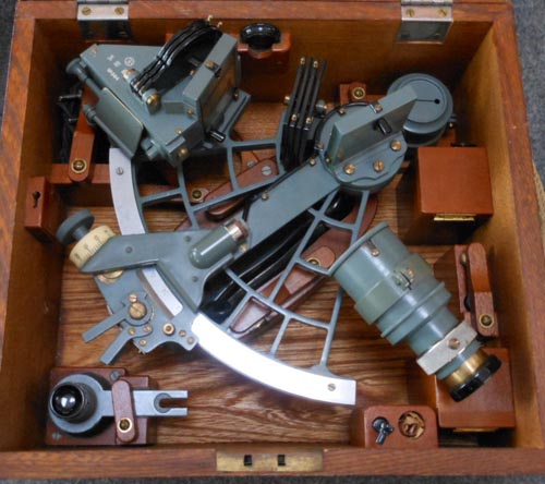 Amazingly, there is still a bubble in the level in the AH, though the two spare levels in the box are dry. I plan to try some sights this weekend when I get a free moment to see how it performs. Other than a sticky spring on the arm (old grease), the sextant looks unused. It still has all the accessories -- two additional scopes, a couple of spare bulbs, brush, adjustment wrench, it even still has what appear to be the original batteries in two wooden compartments in the box. They look quite dead but they made better batteries back then -- no acid leakage. The only missing pieces are the key and, perhaps one of two screw-in solar filters.