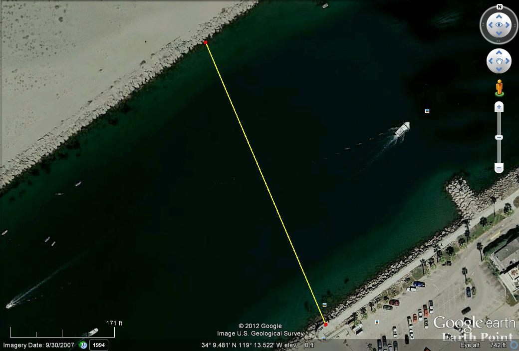 | As long as we are talking about improving our dip corrections I would like to report on something I tried last week. The usual location I go to to take observations with my marine sextants is on the south side breakwater at the entrance to Channel Islands harbor at 34° 09.4' N, 119° 13.5' W. I have attached a Google Earth picture of this location. I have always just estimated my height of eye as 15 feet but it is difficult because I could not just drop a measuring line down to the water level because the sides of the breakwater are not vertical. This time I also brought my A-7 bubble octant because it also has the capability to take observations from the natural horizon and I wanted to try out this capability. Standing there I got an idea. I realized that I could get an accurate measurement of the width of the channel by using Google Earth and that I could measure the angle below the horizon to the waterline on the opposite breakwater and with this information calculate my accurate height of eye. Using the A-7 I measured minus 2° 31' and I lined up the structures in the background so that I could be sure that I was measuring the width of the channel in the right direction. I then took my series of shots and when I got home I pulled up the location on Google Earth and measured the width of the channel as 512 feet which make my height of eye 22.5 feet. I have attached a second Google Earth image showing where I measured the width. Your next question, why not just measure the angle to the horizon and determine dip directly instead using the height of eye to enter the normal dip table? Well, I did that but I only had time to take five readings and the readings have quite a bit of variability so I think the first method would produce a more accurate dip value. The next time I will experiment and take many altitudes of the horizon to see how accurately I can determine dip directly. Obviously an aircraft bubble octant lacks the precision of your theodolite. gl --- On Mon, 4/9/12, Bill Morris <engineer@clear.net.nz> wrote: