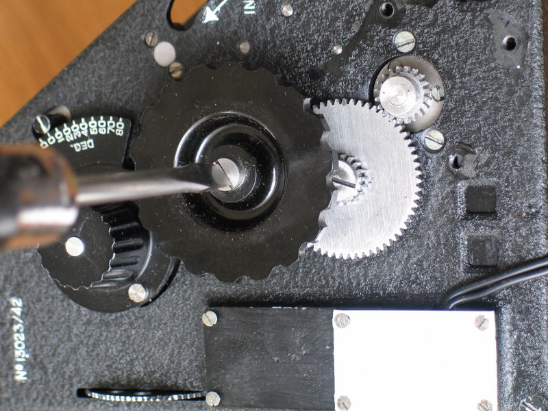 Note that the inner diameter of the bush is considerable larger than the diameter of the screw. This allows the intermediate gear to be adjusted in correlation to both the gear box input gear and the gear of the fine setting knob. Start with gear box gear /intermediate gear correlation. Tighten the intermediate gear screw and test operation by turning the intermediate gear wheel back and forth over the whole adjustment range, operation should be totally smooth in both directions, if not, open screw and readjust intermediate gear away from or towards the gearbox gear, tighten the screw and test again.