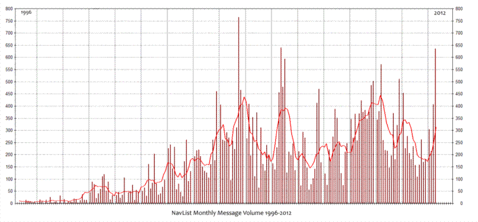 Thanks primarily to the return of Alex Eremenko, NavList message volume this month is near a record. This is nearly certain to be the second busiest month by total number of messages in the seventeen years that we have in the archive.