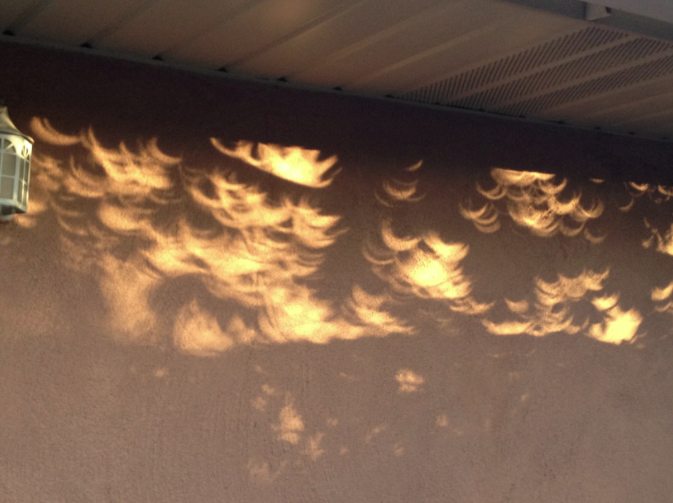 | My neighbor noticed that her shadow had an unusual edge to it so I explained that that was due to the crescent shape of the sun. I also demonstrated for her that by making a small hole using my thumb and forefinger that I could project the crescent image onto the sidewalk. gl --- On Mon, 5/21/12, G Becker <george@gwbeckerpls.com> wrote: