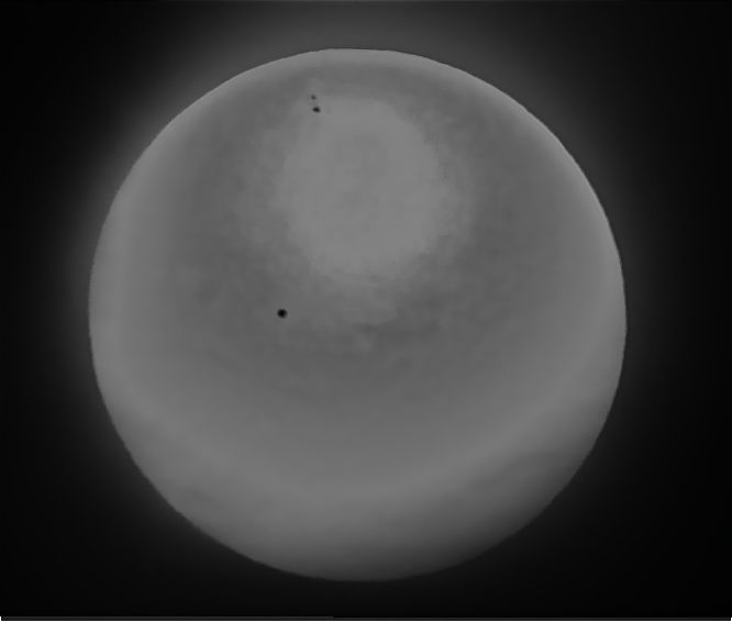 Here is your shot in black and white. Notice that two additional sunspots emerge when the contrast is adjusted.