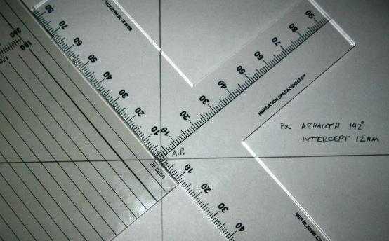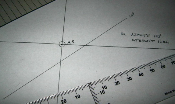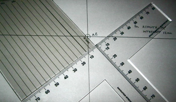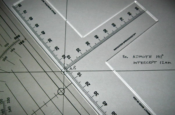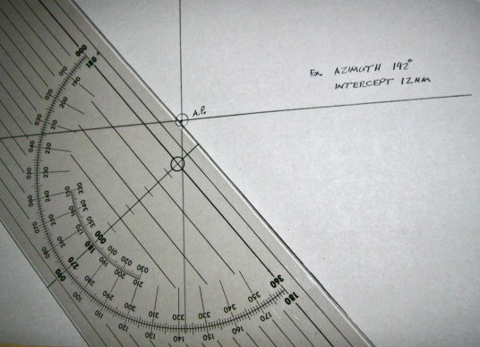 Here is a photo series showing how to plot a celestial line of position using Peter Hackles's graduated T-Plotter and a course plotter. A square protractor will do the same thing as a course plotter in a more compact fashion for navigators with small chart tables. See: