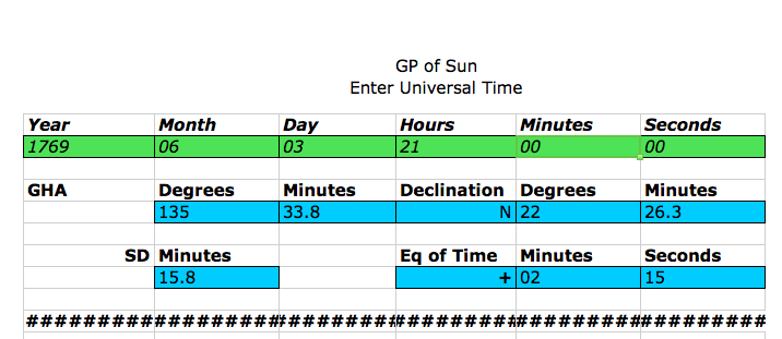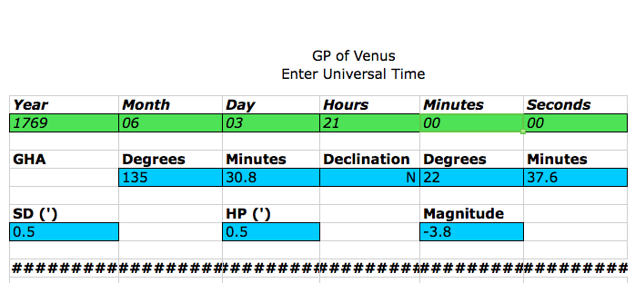 Byron: I just saw a VCR by Ambrose Video, (Ten who dared Captain James Cook. short version.)I know D. K. Kathy Abbass director of the team that believes that his ship HMS Endeavour was sunk off Newport RI and has been trying to find her and to safeguard her. I talked to Kathy this morning about if she was interested in the Celestial placement of the sun and Venus during (Cook's time) the passage? (Bearing and altitude) I think this would be of interest? This was not said in the VCR. I wanted to get the Gmt of the transit and use my 2 minute or 2102 D for the brg and HT. If you have this Sun transit ALT and BRG I would want it. I also wanted to find out if the GHA & DEC. of the sun was close to the today almanac within a degree or so. How far back in time is the 2102 D star disk off within by say 2 degrees in SHA & DEC? Also the sun? Kathy was a little interested but her job is finding/proving, which of the ships sunk and found off Newport is Captain Cooks. Also In the VCR it showed Cook using a horizontal sextant to make Maps, it did not show how he used the angles? How did he?