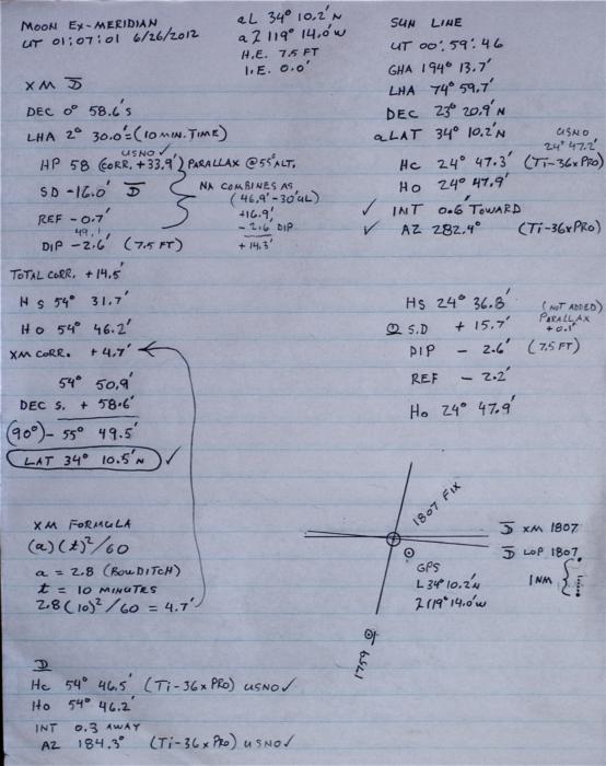 Yesterday I had the Sun and Moon right were I wanted them for a fix and ex-meridian of the Moon. The linked work sheet shows the summing and plot. A 0.2' discrepancy was noticed between the Nautical Almanac and the USNO parallax correction. I prefer the USNO formate (see pic 164 and pic 173) which has each correction listed separately to the Nautical Almanac which combines parallax, refraction, and semi diameter in a confusing set of tables that has instructions in fine print on an adjacent page. There is room for improvement here.