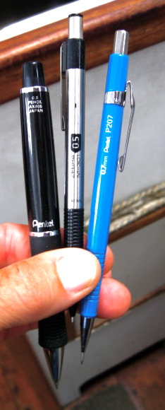 HB 0.7 mm Pentel Ain hi-polymer leads work good for course lines, Lops, and writing. The 0.5 mm will tear the chart but is very good for writing and sight reduction math. 0.9 mm is a hair too fat for my eye but is ok. Anything softer than HB will smudge when erased. The Pentel P207 is my favorite mechanical pencil but it can harpoon a hole in the pocket if you're not careful. Other mechanicals have retracting leads. Lots of choices out there.