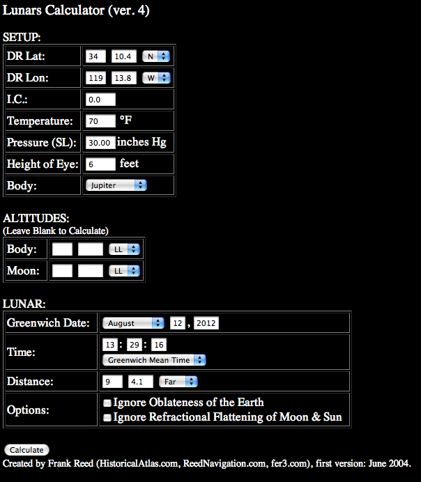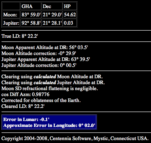 Right after sunrise (no green flash :( a far side Jupiter lunar was taken using a Tamaya Jupiter with a 7x35 mm scope. Index error checked at zero. The result was a personal best using Frank's online calculator.