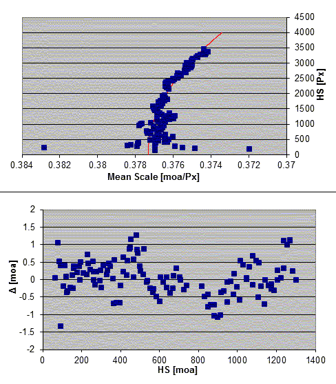 Attached you find the results "_50mm Data ..." obtained for one of these calibrations performed for Greg who decided to use the apparent height of the sun above the horizon (HS) as Z values for calibrating his camera-lens-unit. In the upper figure the blue squares represent the measured distances Z as a function of the scale s [moa/Px] resulting from the individual measurements and the red line the fitted function. The lower figure shows the differences between measured values Z and the product s*D. Note that in the upper figure the large differences in s for low values of Z result in "reasonable" differences Z - D*s which can not particularly be noticed in the lower figure. The lower figure suggests that about 2 out of 3 observations (one standard deviation) are within +/-0.5 moa or about 95% of the observations (two standard deviations) within +/-1 moa. As calibration result one can either use the fitted functions, thus by calculating Z[moa] with the fitted parameters a and b, or by representing the scale s[moa/Px] as a function of D[Px] for obtaining Z[moa] as the product of D[Px] * s[moa/Px] as shown in the attached figure "_50mm Scale ..." which shows also the parameters a and b for each of the two functions. (All of the shown figures were calculated with the second one.)