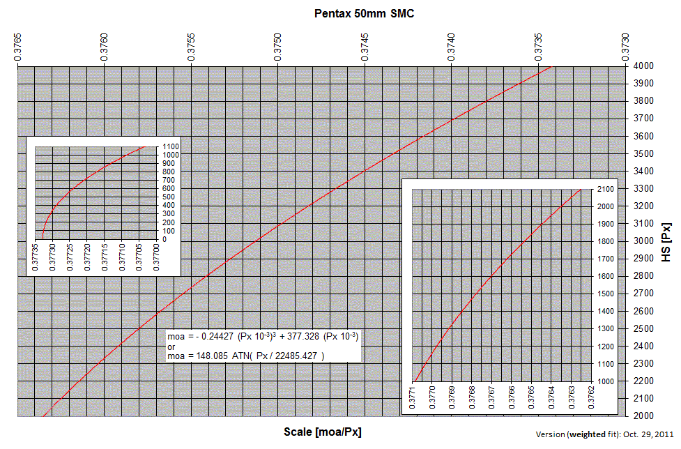 This will be described here only very brief. Measure at different positions along your reference axis (thus not using limitation 4) a known small angular size, like e.g. the unrefracted HORIZONTAL diameter of the sun. From each of these photos one obtains for the pixel position corresponding to the center of the sun a differential scale value ds(x) in moa/Px. All these scale values are then fitted to a function of the type