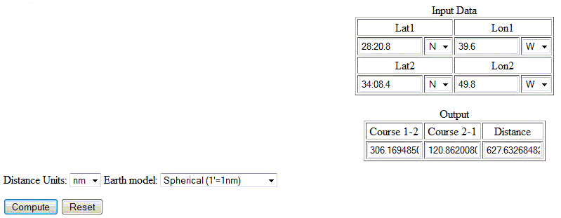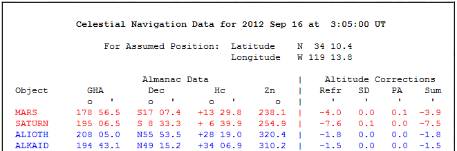 Using the attached USNO almanac data for the time of the observation UT 3:05:00 (instead of UT 2:45:00) one obtains with the attached great circle calculation a Distance=627.6 moa compared to 628.0 moa as measured in photo (and using the calibration obtained from HS measurements).