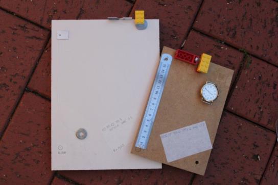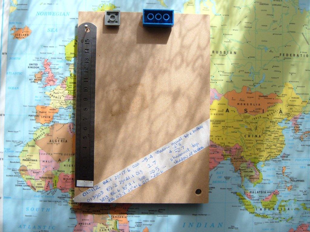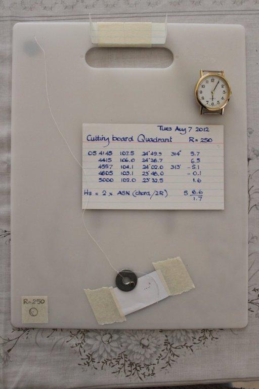 Quad 4 An instrument made from a cutting board costing two dollars. The cotton thread is held at the back of the instrument with blue tack which itself is covered by a piece of card to stop the instrument from sticking when it is put down. The results shown are not unusual. This was one of the first times that I had used a cardboard sight as Lego didn't take to being glued to this type of plastic with the type of glue that I had available.