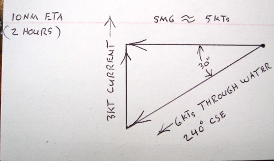 Here is a vector diagram showing a sailboat at 6kts through the water with a current of 3 kts setting 360*. A course mage good of 270* results in a speed made good of 5 kts along the desired track. The ETA for a 10 NM leg is then 2 hours.