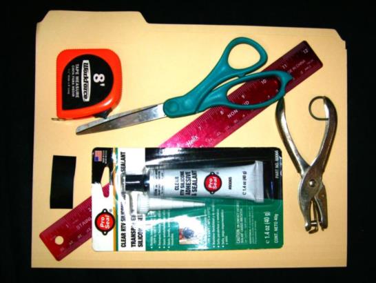File folder, 1/4 inch hole punch, scissors, tape measure, millimeter rule, silicone adhesive, and Thousand Oaks Optical Solar Film. The attached photos are for a pull of 19.5 inches on the tape measure.