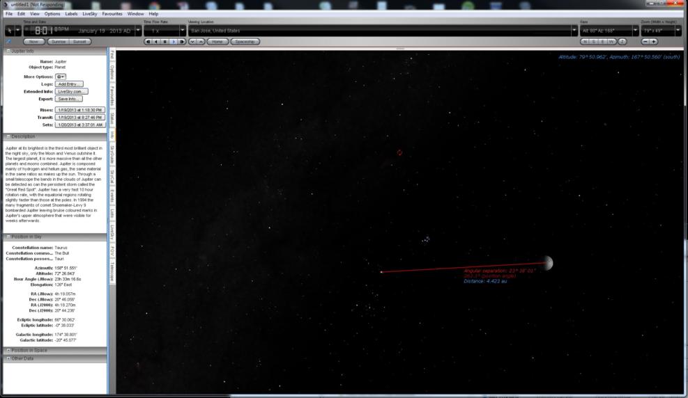 Thanks for your very 'illuminating' reply. The sky is beautiful tonight, here in Silicon Valley, but, alas, I need to align my sextant first and it's late. The Moon and Jupiter will be closer tomorrow night. And on the 19th my Starry Night program gives a distance of 23 deg 40 minutes and closing. I'll be ready! It's interesting to see the two objects move together at a rate of seconds per second, or so it seems. Do I have that right? I guess it is, because I've watched lunar occultations and the occulted body approaches the Moon (Moon approaches occulted body) and disappears very fast.