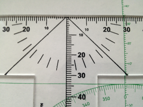 3) The 1 through 9 tics are still shorter than the others but they are now longer than the "dots" used previously. This change will ensure that these tics will not fall off the plotting edge. Also, the tics along the azimuth arm should help keep the plotter parallel to LOPs during the construction of the symmedian point.
