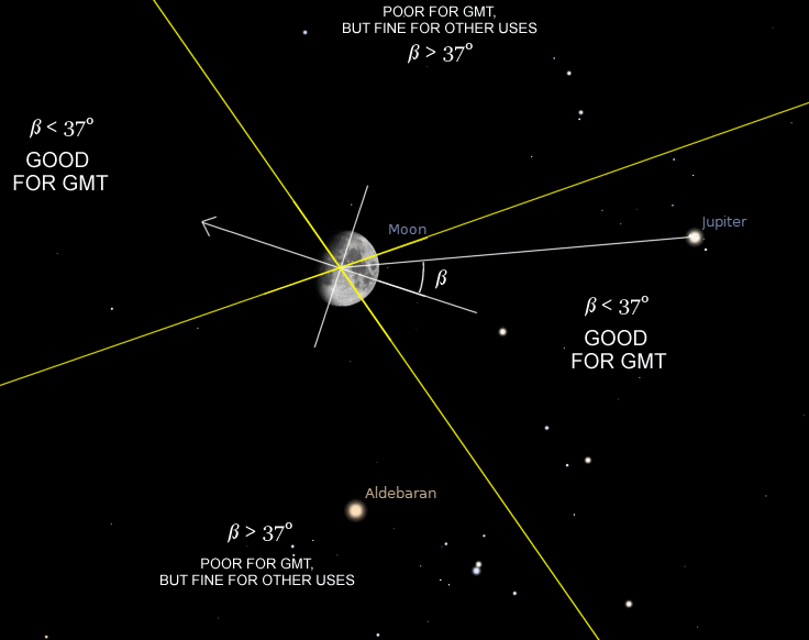 Since the issue of off-angle positions for the other body has come up multiple times in the past couple of weeks, I am attaching a diagram which I hope will be mostly self-explanatory. The Moon's motion across the sky (relative to the background stars) is always in a direction that is nearly perpendicular to its "horns". Draw that line perpendicular to the Moon's horns (which you should find runs nearly along the Moon's equator) and then the other body should be no more than 37 degrees (or so) away from that line as indicated by the angle "beta" in the diagram. The diagram illustrates the situation last week with the Moon moving away from Jupiter. At this time, Jupiter would have been fine for determining GMT, while Aldebaran would have been a bad choice. Note that these very short lunar distances would not have been used historically for other reasons (non-linear interpolation in particular), and I'm just using them here for the sake of illustration. You can easily re-draw this diagram in the sky in your head to decide whether a particular star or planet would be a good choice for finding GMT/UT by lunars.
