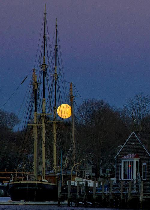 Here's a fun challenge. See if you can figure out the photographer's location and the time of the photo as nearly as possible. The photo was taken from near Mystic Seaport last Saturday, January 26, when the Full Moon was rising not long after sunset (and posted to Mystic Seaport's FB page). Even if you haven't ever been to Mystic, you can work this out. One important piece of information: the three-masted vessel in the foreground is the Joseph Conrad. Behind it is the two-masted schooner L.A. Dunton. Their masts overlap. You can find the Conrad via Google Maps or similar at latitude 41.36197 N and longitude 71.96628 W. You can get a rough estimate of the altitude of the Moon using a technique that Ken Gebhart has described previously with respect to the Sun: the Moon is slightly flattened by refraction and that degree of flattening determines its altitude. Or you could try to guess where the horizon is. You could also attempt to determine the Moon's azimuth from alignments in foreground objects.