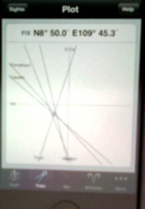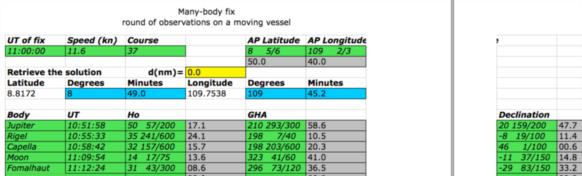 The final step in my case is the many_body_fix.xls spreadsheet that uses the least-squares-based computation procedure described in the Nautical Almanac Commercial Edition, which also includes vessel motion. When I zero out the vessel speed in that spreadsheet, I exactly recover the fix given by the "Celestial" iPhone app: