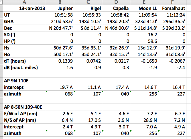 I checked the numbers (ephemerides, Hc's, azimuths, intercepts, etc.) from my spreadsheets against the USNO website and the Navimatics "Celestial" iPhone app. They all agree except for a couple of places, which differ by 0.1' (Moon SD -> Hc -> intercept; Rigel intercept).