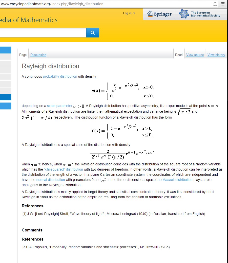 See eq 24, pg 34, for instance, which expresses the Rayleigh distribution of a closely
