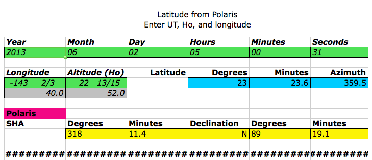 and from Auxiliary Position 24°N / 143°40' , observing Polaris at UT 05:00:31 at Sextant Height 23°04'1 (corrected for only Instrument Error), I got a Geocentric Height Ho = 22°52'0 (I concur with Greg's published value) and an intercept of -36.4' (Away) in Azimuth 359°5, hence an Observed Latitude of N 23°23'6 at time of observation UT 05:00:31 (or a shifted latitude of N 23°23'7 at UT 05:00:00).