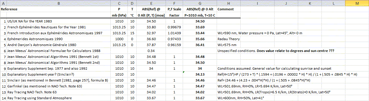 Re: https://navlist.net/Low-Alt-Refraction-USCG-Student-Example-for-Low-Altitude-Cou%C3%ABtte-apr-2013-g23718 and https://navlist.net/Low-Alt-Refraction-Hirose-apr-2013-g23719 Thank you, Kermit, for providing all these different text book values and thank you Paul for your explanation and for the refraction formula from the Explanatory Supplement. Kermit, you wrote: "When appropriate I leave upon you the task of reworking these different results into the very same environmental reference (e.g. 1010 mb and +10°C) so that you can get a good feeling of the Refraction Values dispersion at 0° apparent altitude. My guess is that they all should match the US NA -34.5' value to within +/- 1'. Let me know your results." Yes, for what it is worth I did compile these values and converted them to the same condition. I added also a few more to your list. You find the results in the attached screen shot. The extreme values scatter slightly more than you were expecting. One must however be aware that the "real" values, those resulting from daily and even hourly variations may possibly lead to even larger differences. Just a few comments: The French references differ by almost 3 arcmin. The value from reference #2 agrees close with reference #14, which was obtained by ray tracing using the US Standard Atmosphere (1976) Reference #3: The air pressure is given. I do not know what the water pressure relates to. Reference #6: Could this have been a typo and the value been in degrees, still requiring to add the sun diameter? References #7 and #8: Bennett derived his formula from previous (analytical) work done by Garfinkel. Reference #9: This relates to Paul's comments. Because it refers to the Explanatory Supplement it is assumed that the value relates to the nautical standard conditions (1010 hPa, 10 C). References #10 and #11: It looks like being the same formula. There seems however to be a slight difference. Was #11 not copied correctly? (I do not have the original reference.) Reference #12 and #13: Relate to http://astro.ukho.gov.uk/data/tn/naotn63.pdf Reference#13 uses a simplified standard atmosphere consisting of 2 layers, the troposphere and the stratosphere. Best regards, Marcel