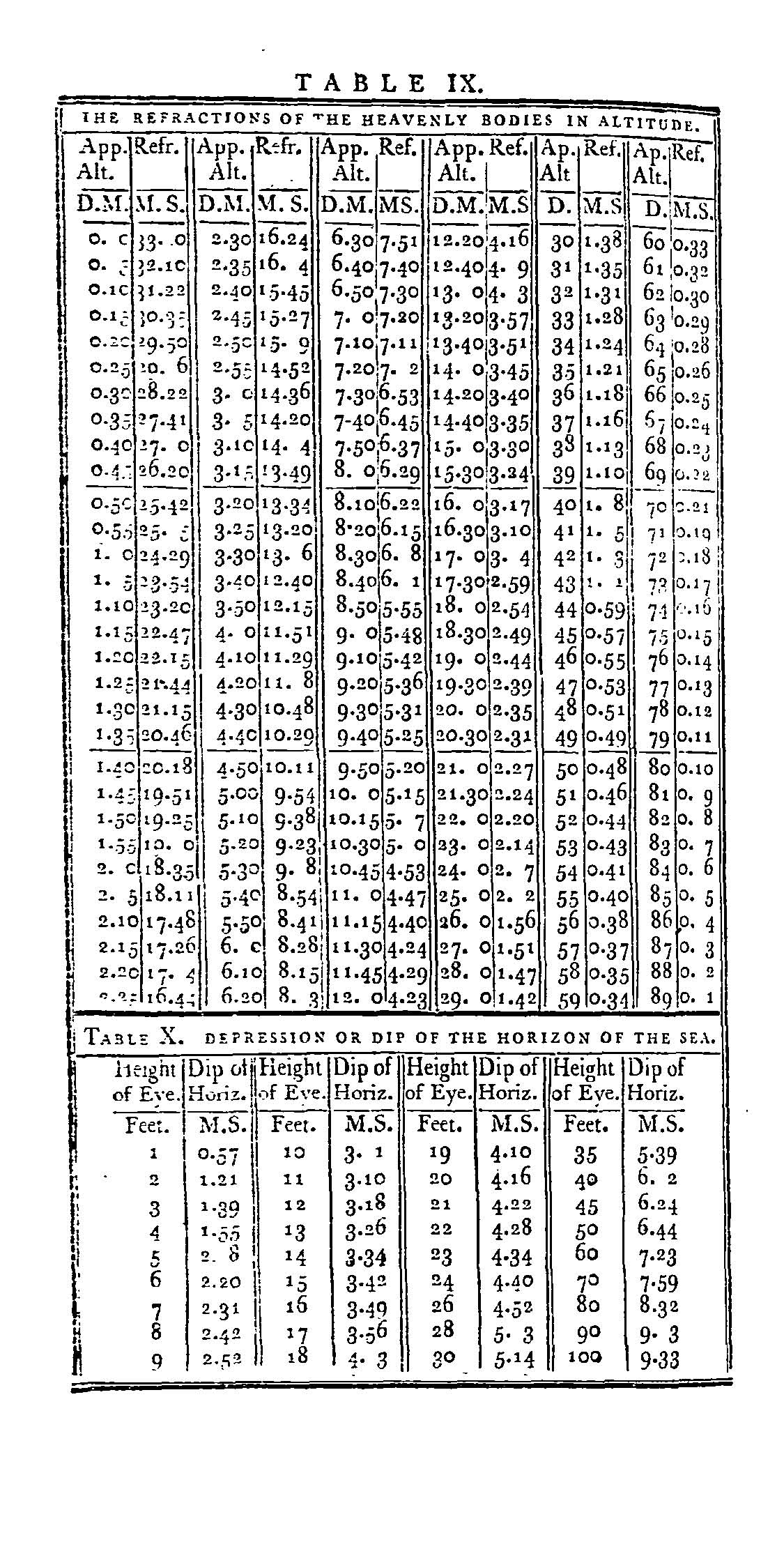I'm not so sure how tricky it was to make those measurements because they sure got accurate results. I am absolutely blown away by the accuracy of the refraction and the dip tables in the 1799 edition of the New Practical Navigator, edited by Bowditch. I compared a sample of the values in the 1799 tables with the modern tables and only rarely did the discrepancy exceed six seconds of arc, 0.1'. See attachments.